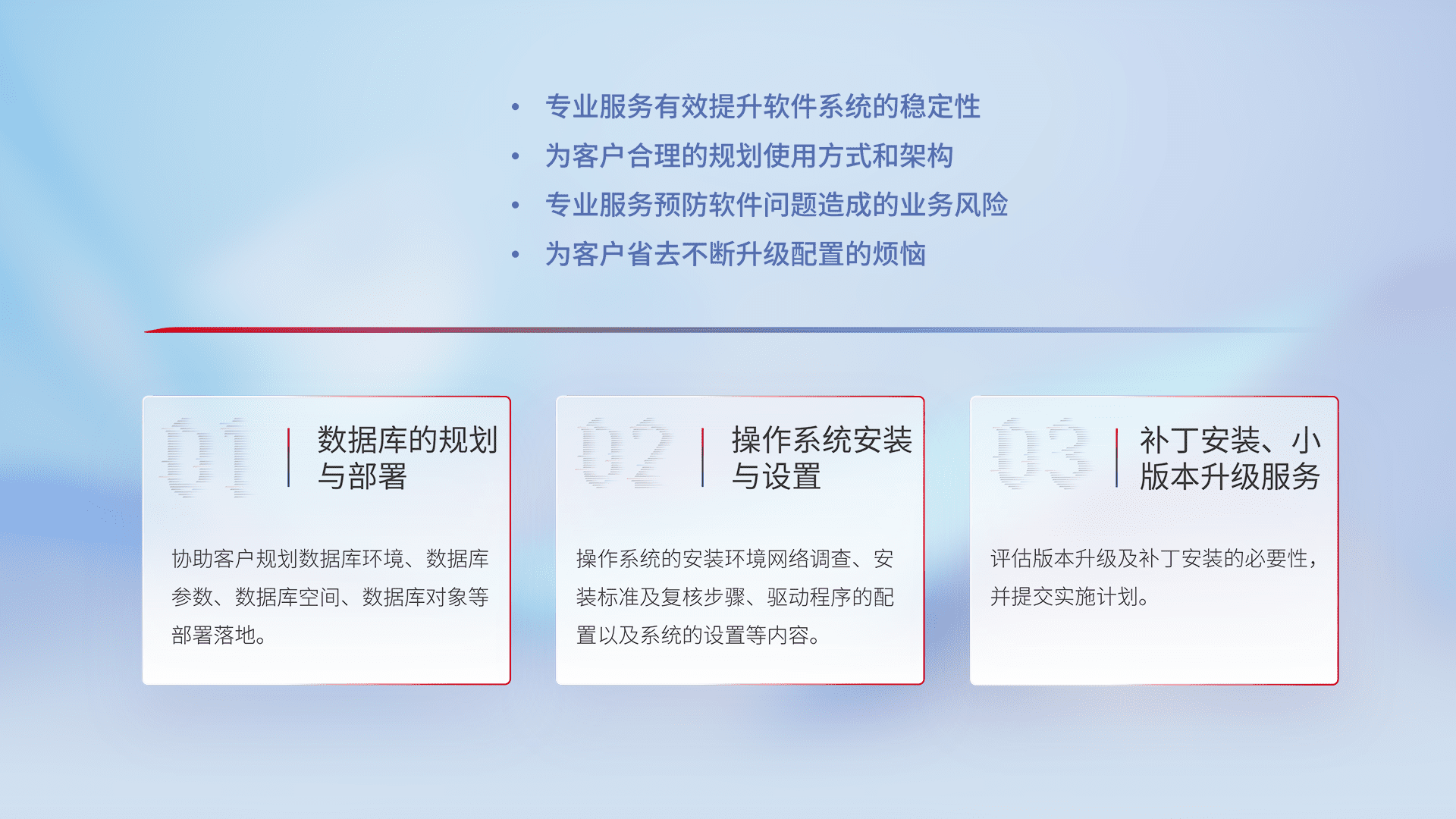 为客户提供软件规模升级、、快速部署、、、、按需配置的专业服务,,,从数据库的规划与部署到操作系统的安装与设置,,,,再到补丁安装和小版本升级提供支持。。。
